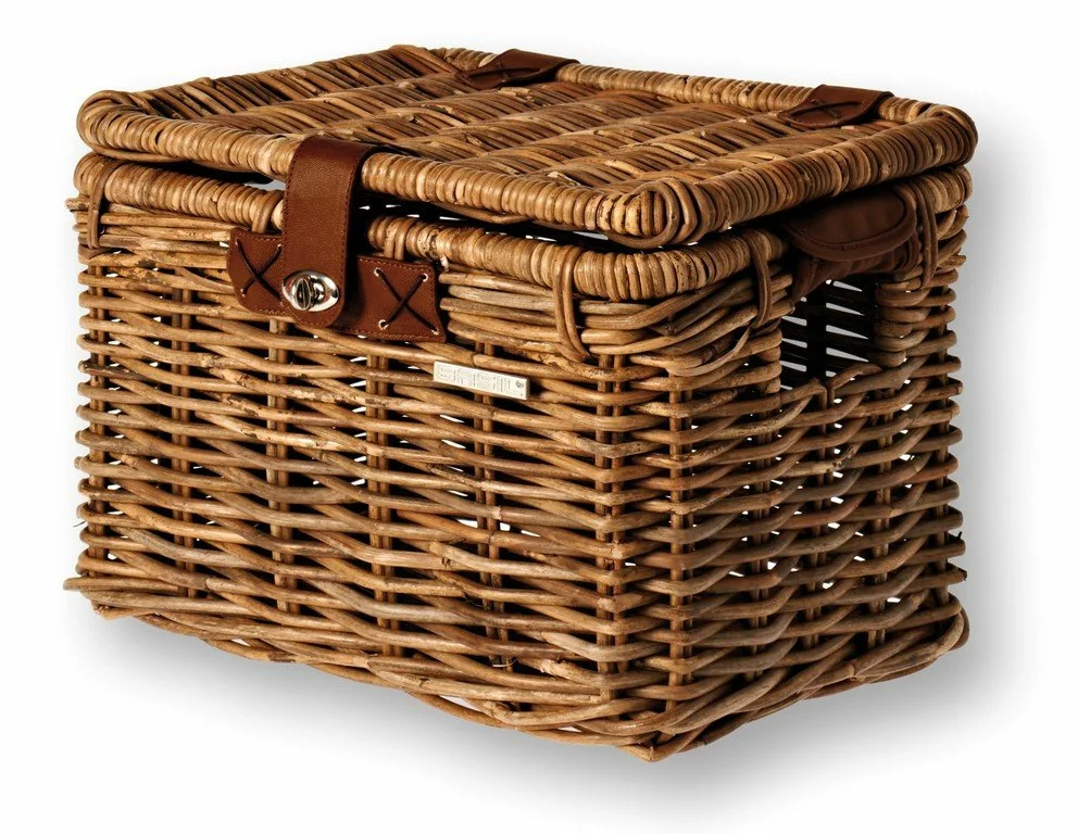 Flot kurv lavet i naturlig rattan flet og detaljer i kunstlæder.