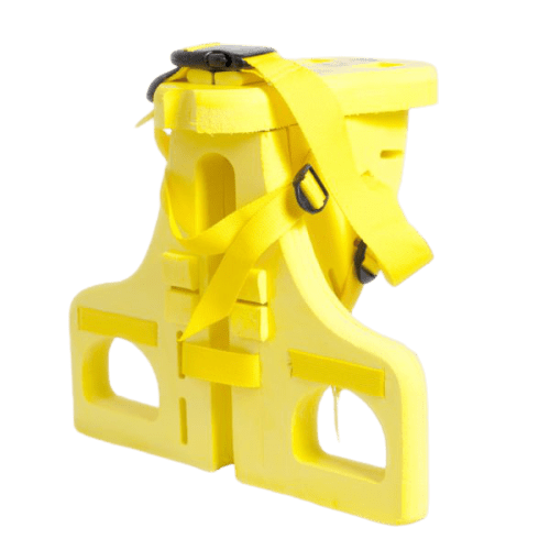 Barnet kan spændes fast på stolen med en strop henover skødet og en til hvert ben.